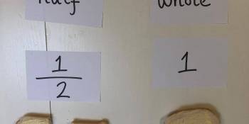 Demonstrating half of a shape 17 June 2019 Rainbow Class have been making shape sandwiches and have been cutting them to demonstrate a half (ensuring both parts are equal.) We understanding that a half is part of a whole. Prev Next