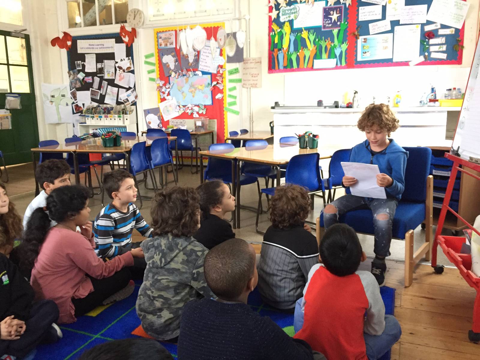 For Everybody Writes, Year 3 have used the beautiful and poetic adventure pop-up book One Moonlit Night as inspiration to write short stories. The children explored the story and engage with the language of the text through print making. The mono-prints were then used to create the background for their own 3D paper boat of dreams. The children then wrote their story stories based on the opening and build up. Later in the week the children got an opportunity to feedback and share their stories with partners and the class. Here are some pictures of the art process and the children sharing their stories.