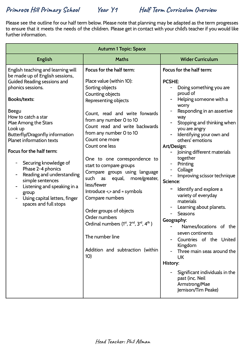 Y1 Autumn 1 Curriculum and Overview Letter